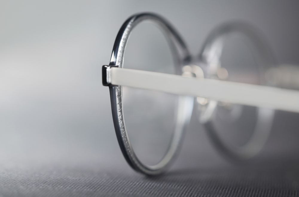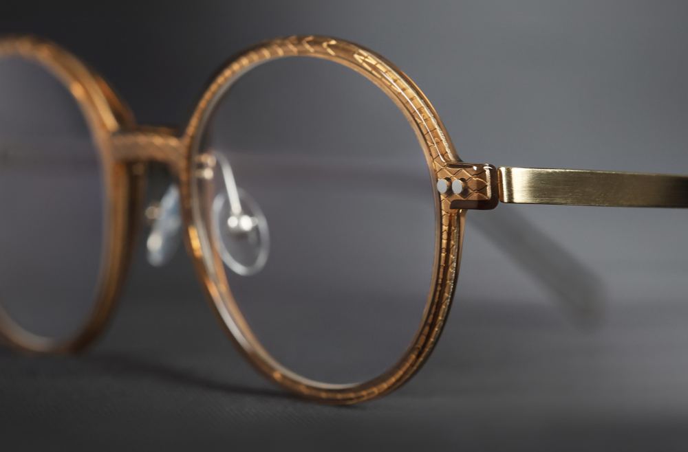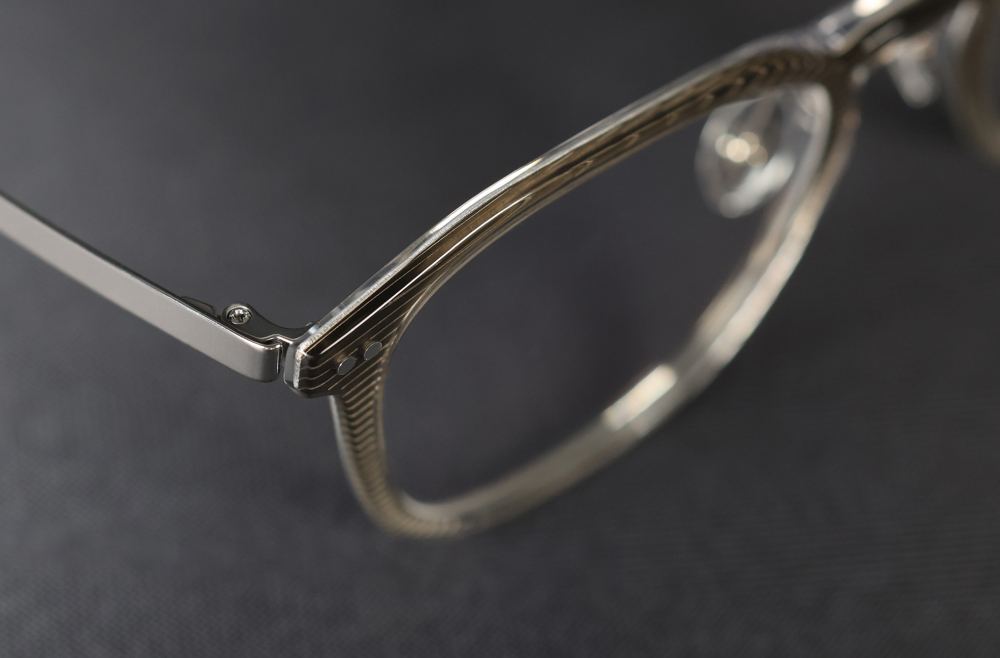 Samlet giver det en total tykkelse på kun 3,1 mm. Til sammenligning ligger traditionelle acetatstel typisk mellem 4,5 og 5 mm. Den indkapslede titaniumsplade er lasergraveret med fine mønstre, som kun anes fra bestemte vinkler. Det gør stellet diskret sofistikeret og giver karakter uden at være prangende.